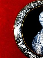 Ecole du XIX ème siècle, « Portrait d’homme de profil en armure » Plaque ronde en cuivre émaillée à décor en grisaille avec rehauts dorés, le pourtour souligné d’une frise de rinceaux et de grotesques. Fixée sur support et encadré. Diamètre : 13 cm. (Accidents, manques, cadre en mauvais état).