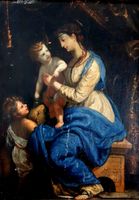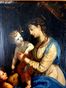 Ecole française du XVII ème siècle « Vierge à l’Enfant et Saint-Jean-Baptiste » Huile sur panneau portant une inscription illisible en bas à droite. (Encadré). Dimensions : 32 x 23,5 cm. (Dimensions avec cadre : 41,5 x 33 cm). (Manques, accidents, restaurations). [Expert : Gérard AUGUIER]