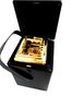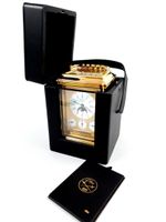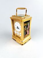 L'EPEE (Fondée en 1839), Pendule de voyage à répétition en laiton doré ouvrant à l’arrière et sur les côtés, les vantaux latéraux à décor d'émaux de Limoges d'après Gustave Courbet, signés P. Bonnet. Cadran émaillé blanc à chiffres romains et arabes avec phases de lune signé « L’Epée 1839 », en dessous trois compteurs secondaires pour jour, mois, et date. Modèle La Cent-Cinquantenaire (1839-1989), série limitée numérotée n°064/150. Dans son écrin et boîte d’origine, avec sa clef de remontage. Dimensions (sans la poignée) : H : 16 cm ; L : 9 cm ; P : 9 cm.
