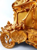 Pendule en bronze ciselé et doré « Allégorie de la musique » surmonté d’une jeune femme à la lyre, à décor rocaille de rinceaux fleuris et de putti musiciens, cadran émaillé blanc à chiffres romains. Fin XIX ème, style Louis XV. Dimensions : H : 42 cm ; L : 38,5 cm ; P : 13 cm. (Avec 2 clés).