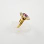 Bague 2 ors 750 mil. à chaton festonné centré d’un rubis taille navette en serti griffes rehaussé de diamants 8/8. (TDD : 51). 3,5 g. brut.