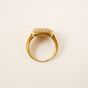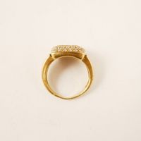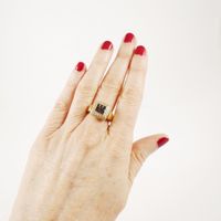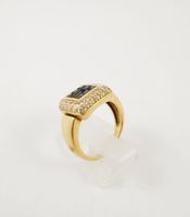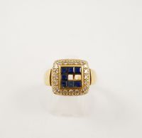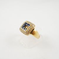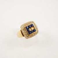 Bague en or 750 mil. à chaton de forme coussin centré de saphirs calibrés dans un double entourage de diamants brillantés. (TDD : 53). (Déformation, pierres manquantes). 6,9 g. brut.