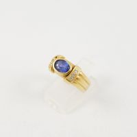 Bague godronnée en or 750 mil. centrée d’un saphir ovale encadré de diamants brillantés. (TDD : 54) (Pierre manquante, égrisures). 5 g.