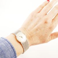 Bracelet-montre de dame BUECHE GIROD en or gris 750 mil., boîtier rond, cadran argenté à index bâtons peints, mouvement mécanique, sur bracelet en or 750 mil. à maille tissée à fermoir cliquet. (Diamètre : 22 mm, longueur : 15,5 cm environ) (Verre rayé). 41,5 g. brut