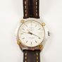 Montre-bracelet d'homme BREITLING "Antares" en acier, boîtier rond, lunette graduée tournante à cavaliers en métal doré, cadran blanc à index bâtons appliqués, guichet dateur à 3H, mouvement automatique, sur bracelet en cuir usagé à boucle ardillon siglée. (Diamètre : 39 mm environ; longueur : 23,5 cm) (Petites usures)