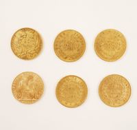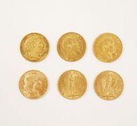 6 pièces de 20 FRF en or 900 mil. (1851, 1868, 186