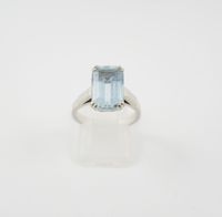 Bague en or gris 750 mil. sertie d’une aigue-marine taille rectangle à pans coupés. (Egrisures). (TDD : 53). 4,8 g. brut