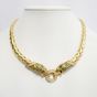 Collier en or 750 mil. à maille palmier aplatie à motif central de panthères affrontées retenant un disque, rehaussées d’émail noir, de diamants brillantés, et d’émeraudes, fermoir cliquet. (Longueur : 40 cm environ). 66,5 g. brut