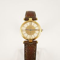 Montre-bracelet de dame Must de CARTIER « Vendôme » en vermeil 925 mil., boîtier rond, cadran crème et doré à chiffres romains, mouvement quartz, sur bracelet en cuir usagé à boucle ardillon en métal doré. Signée et numérotée. (Diamètre : 24 mm). (Oxydations au cadran). 17,8 g. brut.