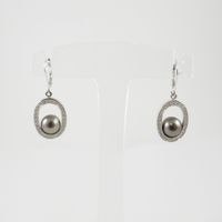 Paire de pendants d’oreilles en or gris 750 mil. de forme ovale ajourés, chacun orné d’une perle de culture grise (diamètre : 8,7 mm), et rehaussé de diamants brillantés. (Hauteur : 3 cm environ). 7,5 g. brut