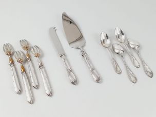 40 / 60 €Lot des années 1950-1960 en métal argenté :- LE COUVERT FRANÇAIS : suite de 12 cuillers à glace modèle tonneau à gradins. Non chiffrées. Ecrin.- DIXI : suite de 12 fourchettes à gâteaux modèle navette à gradins. Non chiffrées. Légères rayures. TBE des deux séries.Lot de diverses pièces de service en métal argenté
