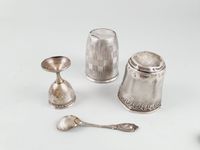 CAILLAT & BELLIER, période Art Déco : Timbale tulipe en argent 950 mil. à décor en damier. Intérieur vermeil. Minerve 1er titre de 1838 et poinçon de Maître (insculpé en 1919). Poids : 48.9 g. H. 8 cm. Rayures, usures et déformations d’usage. + Lot accidenté en argent 950 mil. du XIXe siècle : 1 coquetier (H. 6.8 cm) et 1 cuiller à œuf de la maison LENAIN & Fils (1920-1929), 1 timbale à vagues déchiquetées. Poids : 70.2 g.