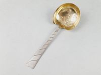 LABAT & PUGIBET, période ART NOUVEAU : Cuiller à crème en argent et vermeil 950 mil. à spatule palmiforme et décor de filets torsadés. Le cuilleron gravé de rinceaux feuillagés. Minerve 1er titre de 1838 et poinçon de Maître de L & P alène de cordonnier (actif 1877-1897). Poids : 112.4 g. L. 23.2 cm. Non chiffrée. Légères rayures. TBE.