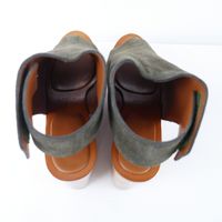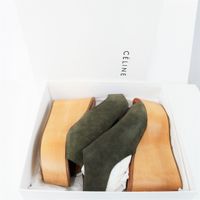 CELINE. Paire de sandales compensées à plateforme en cuir suède marron-kaki, bois, fermeture à scratch. Talon bois 10cm environ dont 7 cm de plateforme. Pointure 39. Boîte. Bon état, légères traces.