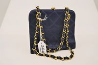 CHANEL. Sac de soirée en satin matelassé bleu marine, anse chaîne bandoulière métal doré entrelacée de satin bleu, fermoir kiss lock. Intérieur doré 1 poche zippée, hologramme. Logo Chanel brodé sous le sac. H : 14 x L : 16 x P : 6,5cm environ. Carte d’authenticité. Trace de pliure sous le sac.