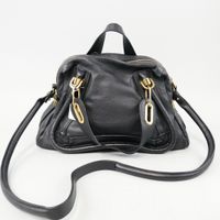 CHLOE. Sac « Paraty » en cuir grainé noir. Double poignées, anse bandoulière, fermeture éclair, garniture en métal doré. Porté main, épaule ou bandoulière. Intérieur en tissu noir, 2 poches dont 1 zippée. Numéroté 03145065. H : 23 x L : 36 x P : 13cm environ. Taches.