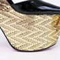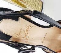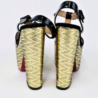 Christian LOUBOUTIN. Paire de sandales « So Bella » Black Champagne en cuir vernis noir, plateforme métallisée dorée. Fermeture avec bride réglable à la cheville. Talon : 15cm environ dont 7cm de plateforme. Pointure 36. Dustbags, paire d’embouts de talons neuf. Quelques usures sur la partie doré, semelles rouges usées.