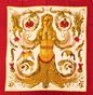 HERMES Paris. Carré en twill de soie imprimé et titré « Cérès », à bordure rouge dans les tons beiges, signé Fr. Faconnet. 89 x 87cm environ. Taches. Edité pour la première fois en 1967 vert et rouge.