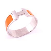 HERMES Paris Made in France – Bracelet « Clic Clac H » en métal argenté palladié et émail orange. Signé. (Tour de poignet : 16cm environ ; Largeur : 20mm). (Rayures et griffures).