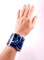 HERMES Paris Made in France. Très beau bracelet manchette extra large 58mm en métal argenté émaillé palladié à décor géométrique dans les tons bleu, blanc, turquoise. Signé. Diamètre : 6,5cm. Marquage « S » de Soldes. Bon état.