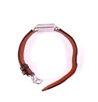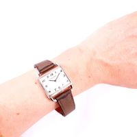JAEGER LECOULTRE pour HERMES. Montre-bracelet « Etrier » ou « Footing ». Boitier rectangulaire en acier (24 x 29mm environ), attaches étrier. Cadran crème signé Jaeger LeCoultre à chiffres arabes, couronne de remontoir à 6 heures. Mouvement mécanique calibre 818/2 à remontage manuel Jaeger LeCoultre. Fond clippé signé Hermès Paris. Bracelet en cuir marron et boucle ardillon en acier non signés. Sans écrin, ni papiers.