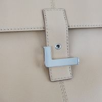 LANCEL. Serviette/Porte-documents en cuir sable à poignée supérieure et garniture métal argenté. Intérieur en tissu rayé beige et marron à un seul soufflet, composé de 2 compartiments et 2 poches. Fermoir en L en métal argenté sur rabat. Poche extérieure. Dustbag. H : 28 x L : 38 x P : 5cm environ. Très bon état.