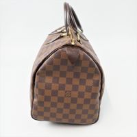 LOUIS VUITTON. Année 2011. Sac « Speedy » 35cm, toile Damier Ebène et cuir en coordonné, fermeture éclair, double poignées, garniture laiton doré, intérieur en tissu rouge, poche intérieure. Cadenas et 1 clé. H : 23 x L : 35 x P : 18cm environ. Quelques petites taches, salissures et taches à l’intérieur, une attache personnalisée et estampée : N.B.