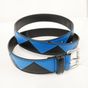 PRADA. Ceinture en cuir bicolore noir et bleu turquoise à décor de triangles, 25mm, boucle en métal argenté, passant de ceinture (taille 85). Taille ajustable : longueur minimum : 78cm ; longueur maximum : 88cm ; longueur totale : 100cm environ. Housse. Bon état.