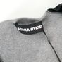 SONIA RYKIEL - Pull sans manche en jersey de soie et cachemire noir et gris, encolure en V, fentes de côté volantées. Griffe noire, graphisme blanc. T. M. Très bon état.
