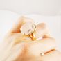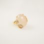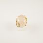 Bague 2 ors 750 mil. retenant un important cabochon de quartz rose dans un décor végétal dont une des fleurs est sertie de diamants brillantés, travail français (TDD : 56) (dimensions : 2,1 x 1,7 cm environ) (tout petits éclats). 13,1 g. brut
