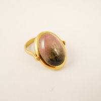 Bague en or 750 mil. à chaton mobile orné d’un cabochon de tourmaline « melon d’eau » ovale en serti clos (TDD : 57 environ) (dimensions : 2,1 x 1,7 cm environ). 9,8 g. brut