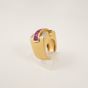Bague tank en or rose et gris 750 mil. centrée d’un rang de rubis et de 2 pierres imitation rouge calibrés, encadré de 4 petits pavages de diamants 8/8, travail français des années 1940 (TDD : 46) (largeur : 1,4 cm environ) (égrisures, éclats, trace de mise à grandeur). 9,6 g. brut