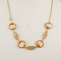 Collier en or 750 mil. alterné de 3 maillons filigranés et de 4 camées coquille en sertis clos (longueur : 46 cm environ) (diamètre : de 0,7 à 1,4 cm environ) (4 nœuds). 10,2 g. brut