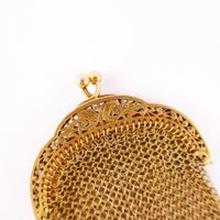 Bourse porte-monnaie en cotte de maille en or 750 mil à 2 compartiments, munie d’un anneau de suspension, le fermoir finement ciselé et ajouré de dauphins et feuillages, travail vers 1900 (dimensions : 9 x 5 cm environ). 39,9 g.