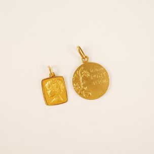 Lot en or 750 mil comprenant : collier (long. : 46 cm) ; 7 pendentifs (grenat, métal), bracelet-montre de dame LIP avec boîtier en or et bracelet en métal (12,1 g. brut). (Chocs, déformations, usures, rayures). Poids total brut : 36 g. brut