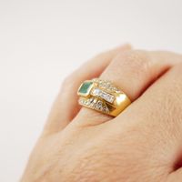Bague bandeau en or 750 mil centrée d’une émeraude en serti clos, pavée et épaulée de diamants tailles brillant et princesse. Travail français. (TDD : 52 ; Largeur : 1,1cm). (Egrisures, fêles). 5,2 g. brut