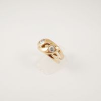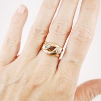Bague « Serpents entrelacés » en or rose 750 mil, les têtes des reptiles serties de diamants taille ancienne de 0.25 carat environ chaque. Travail de la fin du XIXe siècle. (TDD : 57 ; Largeur : 1cm). (Usures à l’or, déformations à l’anneau, traces de mise à taille). 7,2 g. brut