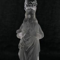 Cristallerie de PORTIEUX Paire de bougeoirs en verre moulé-pressé blanc transparent et satiné figurant le Christ au cœur enflammé et la Vierge Marie, piètement quadripode à décor de têtes d’angelots ailés. Signature moulée sous la base. Hauteur : 30 cm. (Légers éclats)