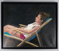 Ecole contemporaine « Jeune femme à la chaise longue » Huile sur toile, non signée. Dimensions : 60 x 73 cm. (Encadrée)