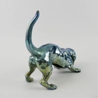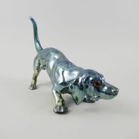 Manufacture de RAMBERVILLERS « Basset » d’après un modèle crée par Charles Virion (1865-1946). Grès flammé à reflets métalliques bleus et verts, les yeux en sulfure. Sans marque. Dimensions : 26 x 37 x 13 cm.