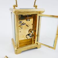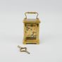 Pendulette d'officier en laiton doré à cinq glaces biseautées, cadran émaillé blanc à chiffres romains et cadran secondaire à chiffres arabes. Avec une clé. Dimensions (hors poignée) : 11,2 x 8 x 6,5 cm. (Accident à l’émail en bas à gauche)