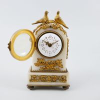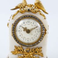 Petite pendule borne en marbre blanc et bronze doré, surmonté d’un couple de colombes, à décor de branches de lauriers et nœuds de rubans, cadran émaillé blanc à chiffres romains rehaussé d’un entourage de pierres du Rhin, base rectangulaire à frise de perles reposant sur 4 pieds toupie. Style Louis XVI de la fin du XIXème-début du XXème siècle. Avec une clé. Dimensions : 17,5 x 9,5 x 5,5 cm.