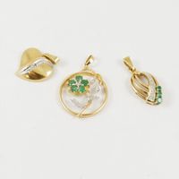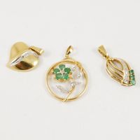 3 pendentifs en or 750 mil dont un coeur, un à motif floral et un en fils d'or (Diamants 8/8, émeraudes). 6,3 g brut.