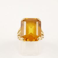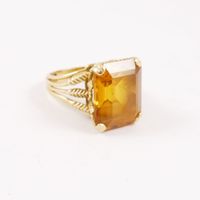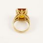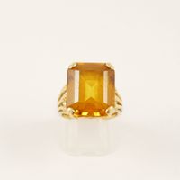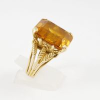 Bague en or 750 mil à chaton orné de motifs floraux, rehaussés d'une pierre imitation orange (TDD : 59,5). 13,8 g brut.