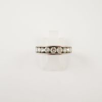 Bague jonc en or gris 585 mil sertie d’une ligne de diamants taille brillant (9x0.10ct environ). (TDD : 51,5 ; Largeur : 5mm). (Chiffrée). 4,2 g. brut