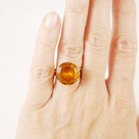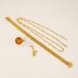 Lot en or 750 mil : Collier à maille Figaro (long. 56cm), Bracelet à maille américaine (long. 18cm), Bague (pierre de synthèse orange) (TDD : 52,5) et Pendentif « Saxophone ». (Petits chocs et déformations). 29,3 g. brut