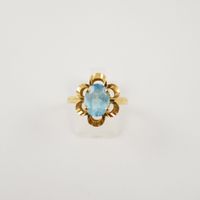 Bague fleur en or 750 mil. guilloché et facetté, centrée d’une topaze bleue ovale, travail français (TDD : 60) (dimensions : 1,6 x 1,3 cm environ). 3,7 g. brut