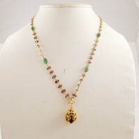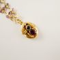 Collier en or 585 mil. serti d’émeraudes ovales (racine) alternées de saphirs bleus et roses, fermoir en or 750 mil. (longueur : 44 cm environ) (largeur : 0,6 cm environ) (égrisures) + Pendentif (anciennement ouvrant) en or 750 mil. orné d’une abeille sertie de rubis et d’un saphir (hauteur : 2,4 cm environ) (accroché au fermoir, soudure au niveau de la charnière, fêle au rubis). 13,7 g. brut
