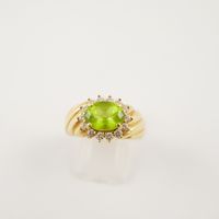 Bague jonc godronnée en or 750 mil. centrée d’un péridot taille ovale dans un entourage de diamants brillantés. (TDD : 56). (Egrisures). 9,4 g. brut