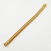 Bracelet en or 750 mil. à maille fantaisie, fermoir cliquet avec huit de sécurité. (Longueur : 20 cm environ). (Largeur : 1,2 cm environ). (Petits chocs). 29,2 g.